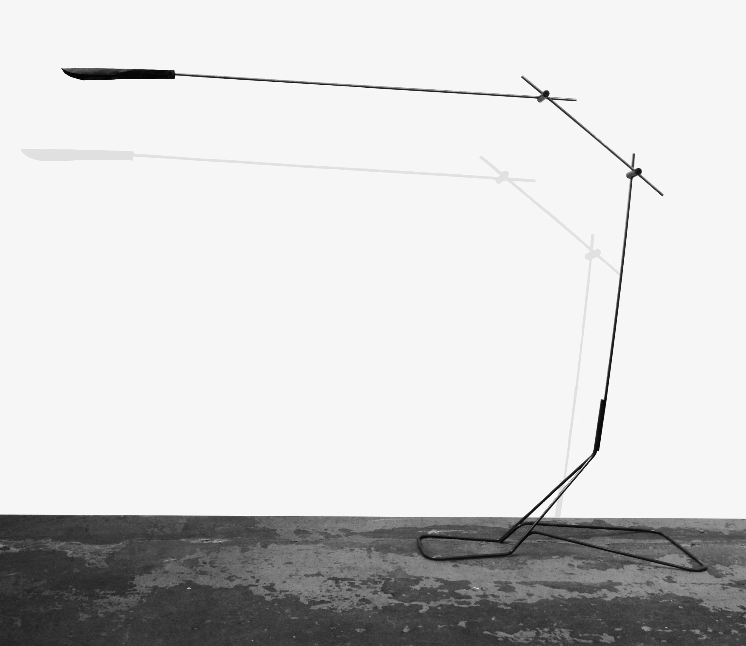 The lamp stems vertically from a bent steel base. The shade continues the dynamic profile with minimal mass.
