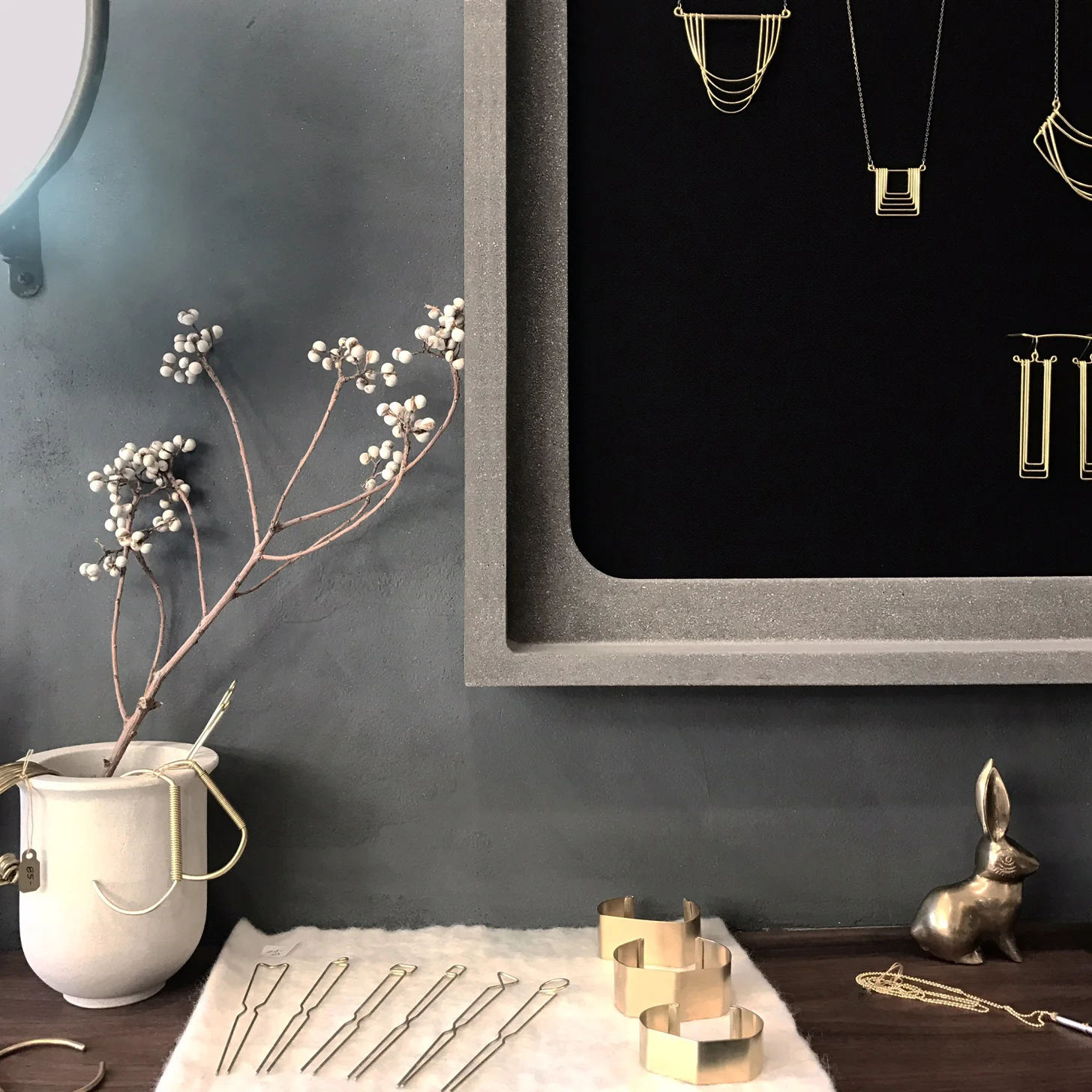 This mirror marries delicate and monolithic qualities using ultra thin concrete to support a beautifully flat mirror. Available in two sizes.